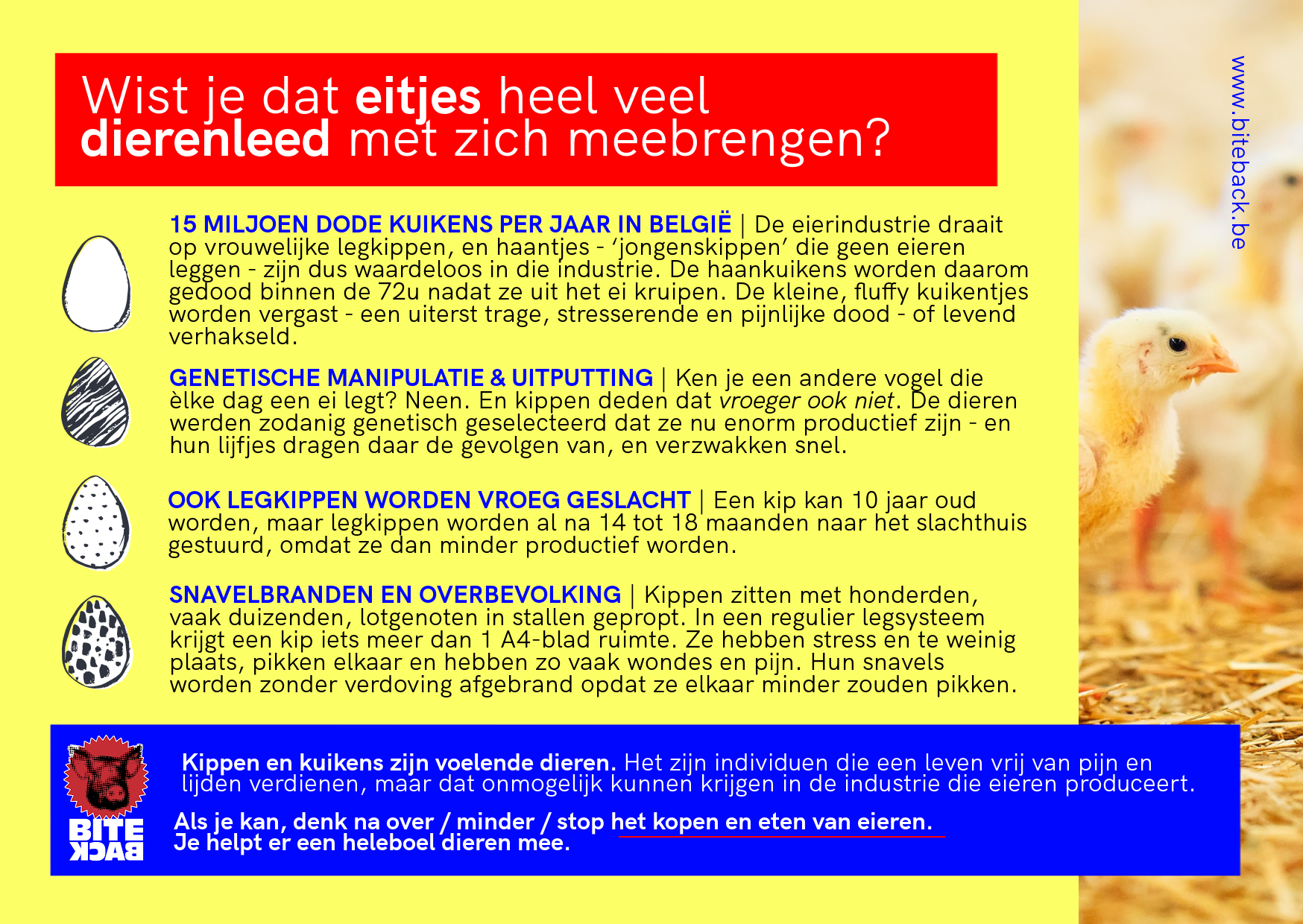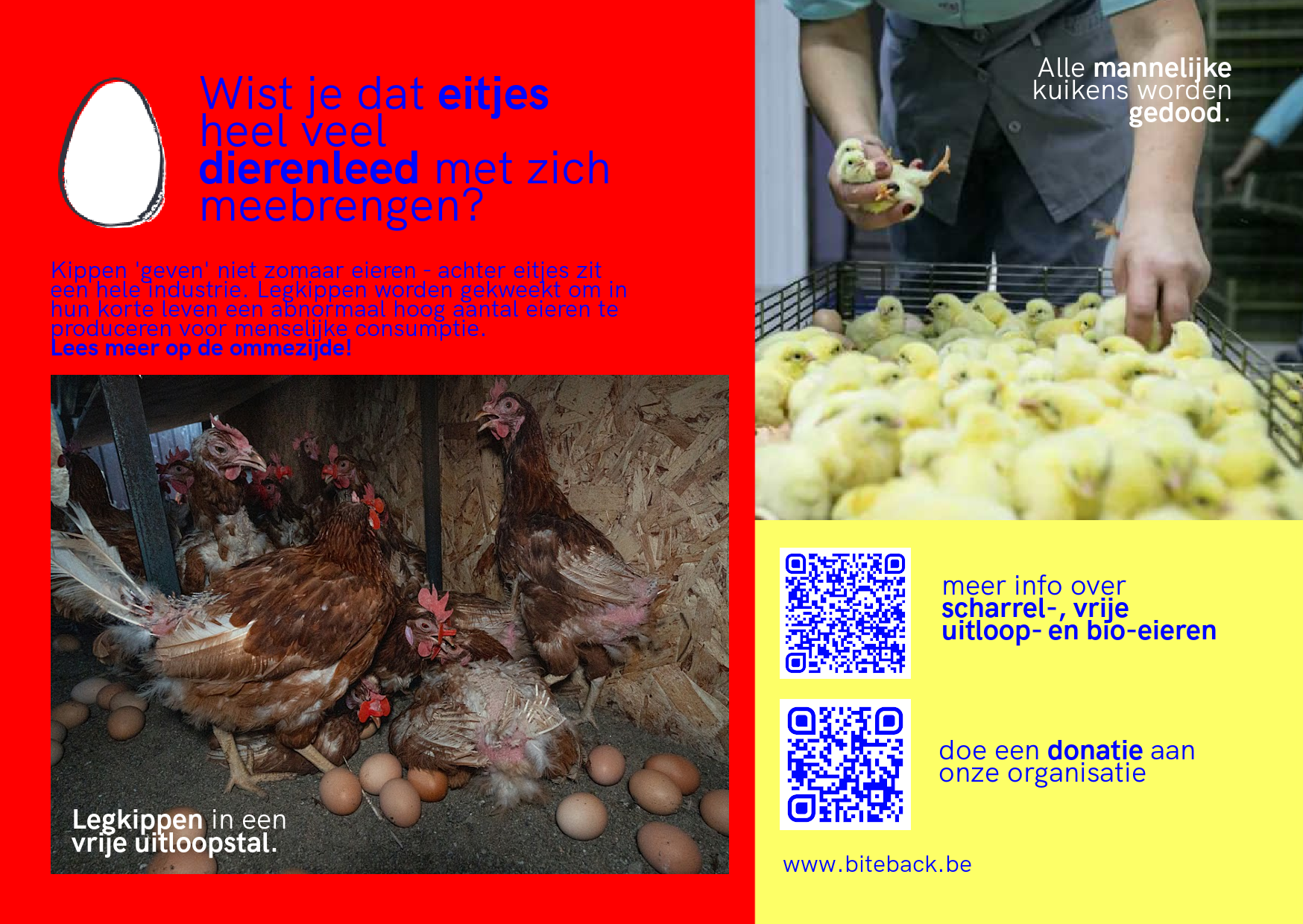 Met deze dubbelzijdig bedrukte kaartjes verspreid je info over de eierindustrie aan kennissen en vrienden.